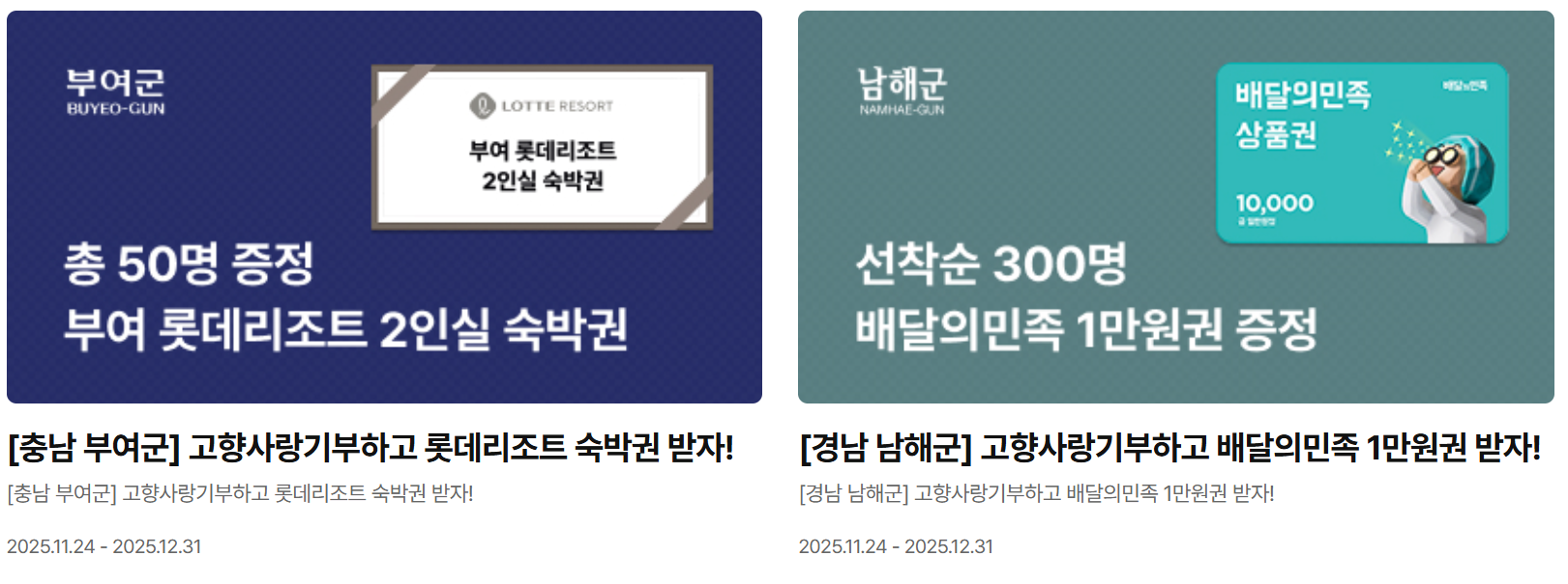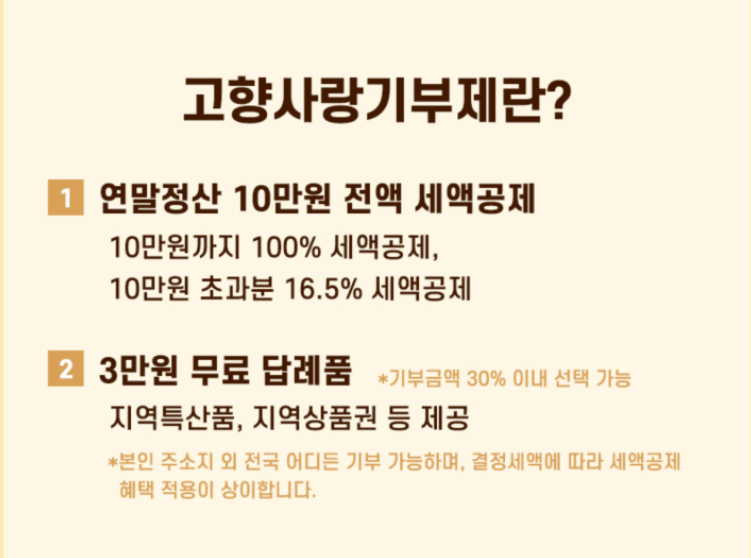 - 답례품 : 기부금의 30% 이내에서 지역 특산품·숙박권 등 제공 가능