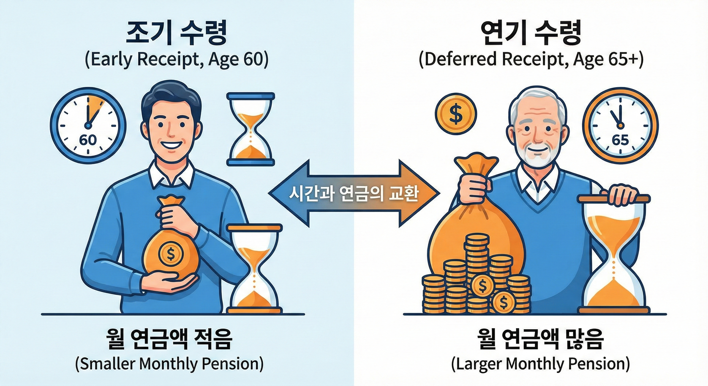 조기 수령은 당장 생활비를 보완하는 데 유리하지만, 평생 받는 연금액이 줄어드는 효과가 있고, 연기 수령은 그 반대입니다.