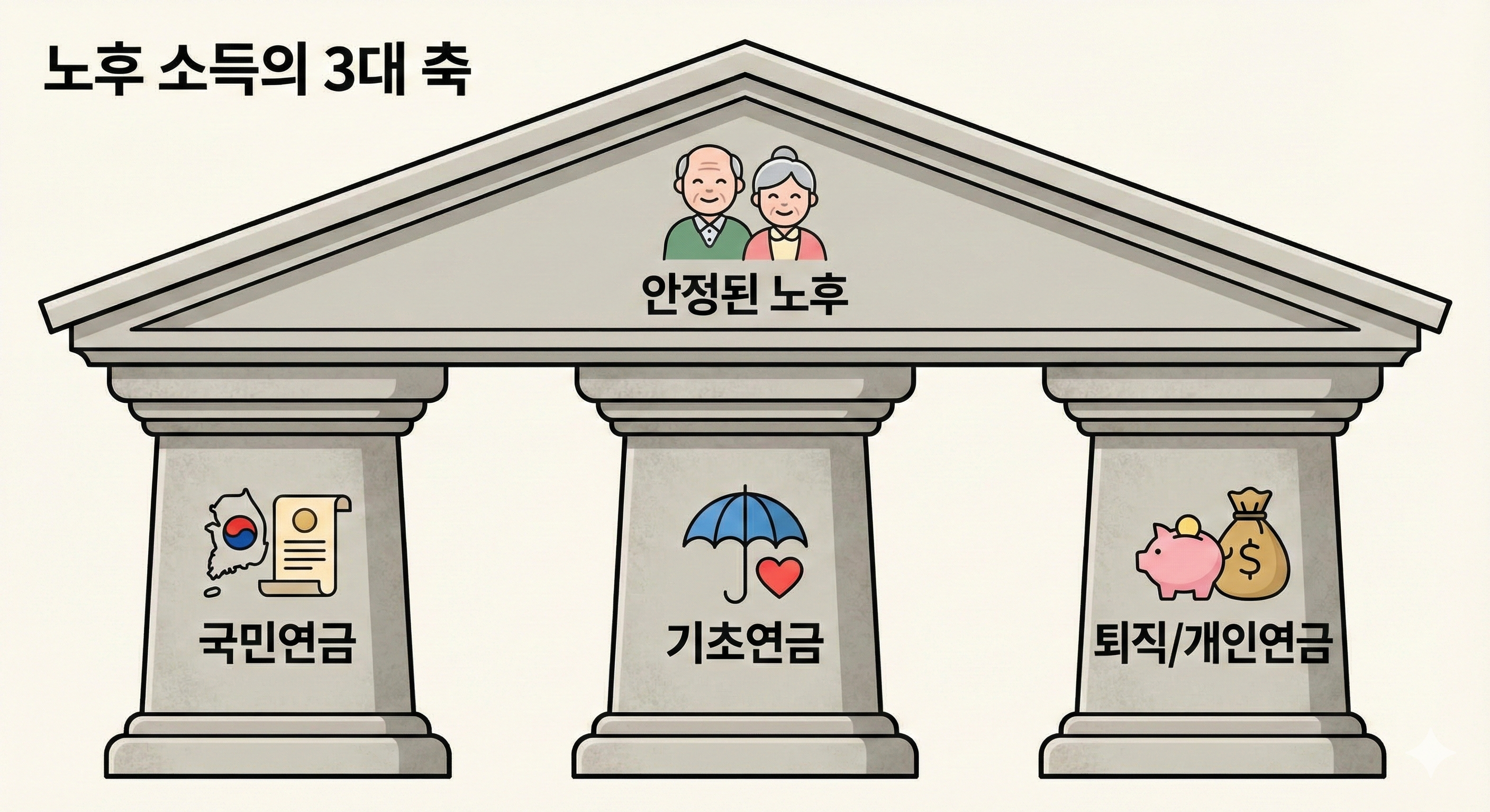 60대 전후의 노후 소득은 대체로 세 가지 축으로 구성됩니다. 국민연금, 기초연금, 그리고 퇴직연금(또는 퇴직금)이 그것입니다. 이 외에 개인연금, 금융자산, 근로소득 등이 더해질 수 있습니다.