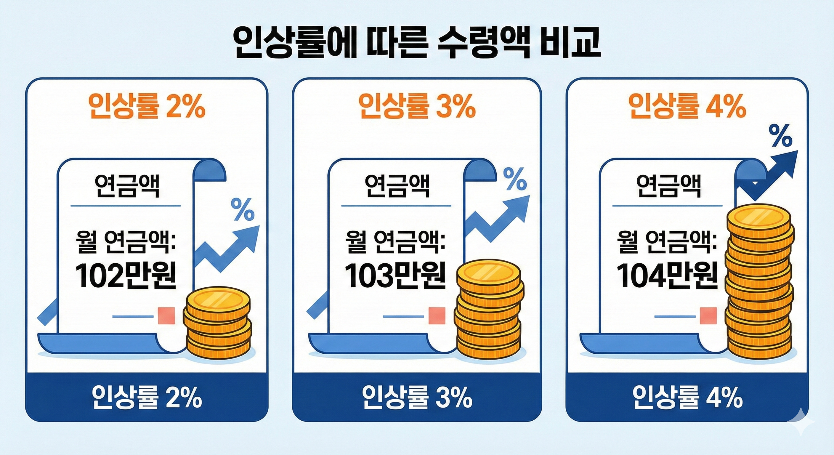 즉, 내 연금액은 매년 “기존 금액 × (1 + 인상률)” 방식으로 조금씩 계단식으로 올라가게 됩니다.