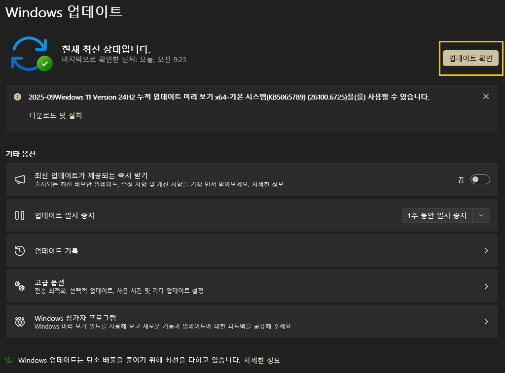 설정 → Windows Update → “업데이트 확인” → “Windows 11 버전 23H2 준비 완료” → 설치