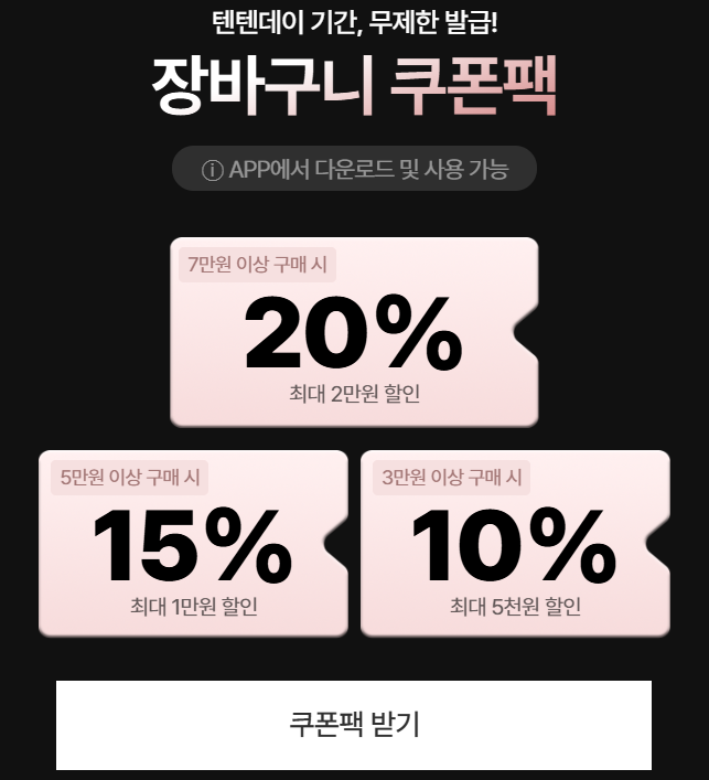 탑텐몰 공식 이벤트 페이지에서는 온라인 단독 혜택으로 사전 쿠폰, 장바구니 할인, 타임특가 등의 행사가 운영된다.