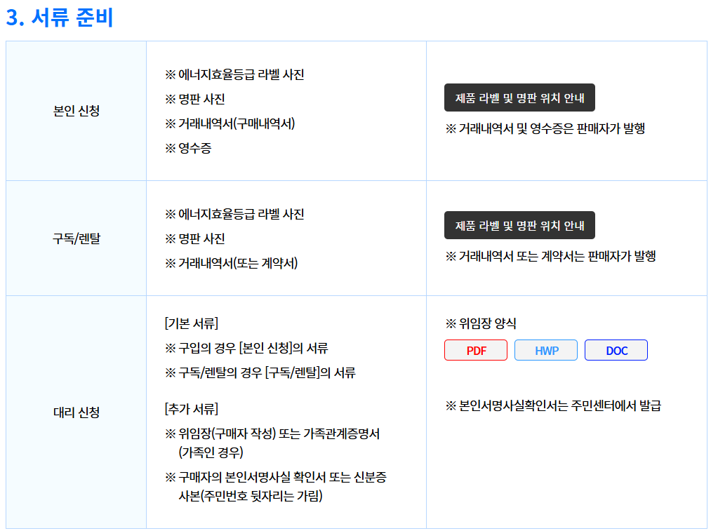- 구매영수증, 제품명판, 효율등급라벨 사진 준비