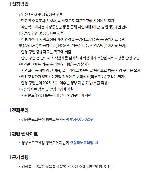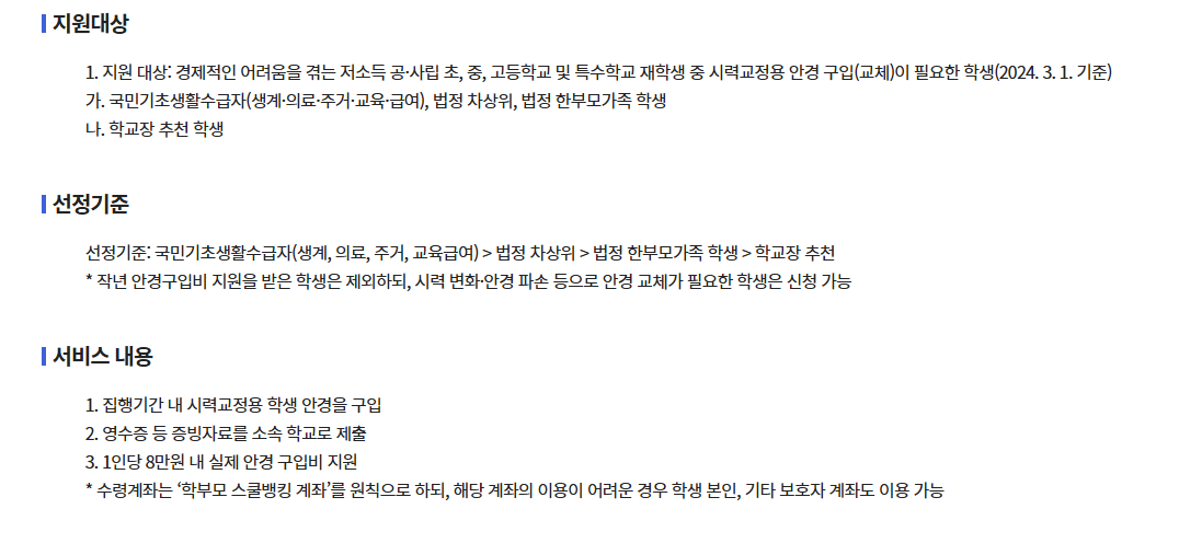 - 경북 관내 공·사립 초·중·고·특수학교 재학생 중 시력교정용 안경 구입이 필요한 학생(기준일: 2024.03.01.)