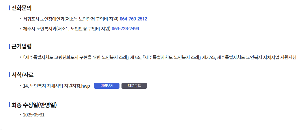 - 제주시 노인복지과(저소득 노인 안경 구입비) ☎ 064-728-2493