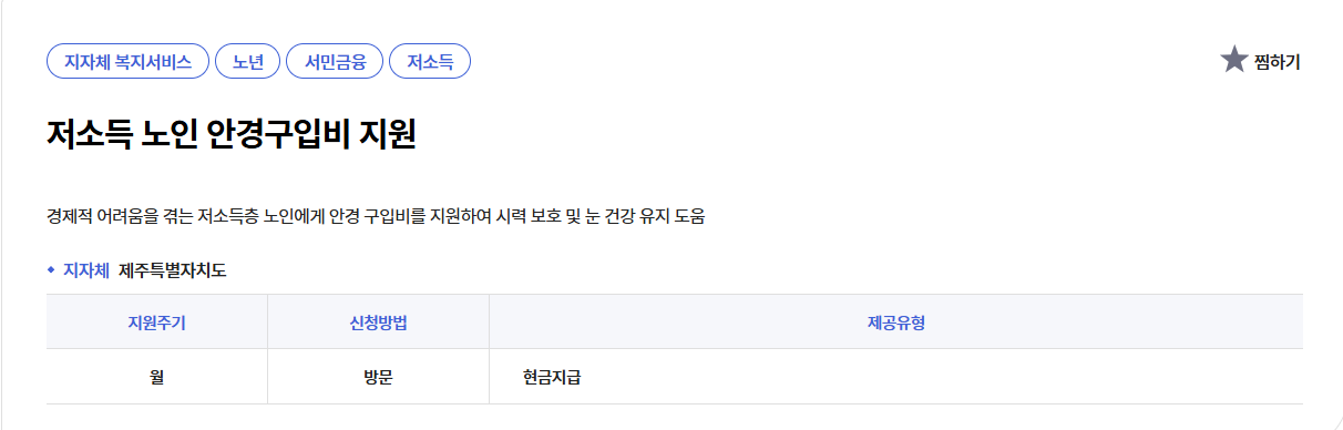 | 제주 저소득 노인 | 신청서, 신분증, 통장사본, 영수증 | 안경구입 확인서 또는 안경원 영수증(내역 상세) / 안과 처방전 | 읍면동 방문, 매월 20일 입금 |