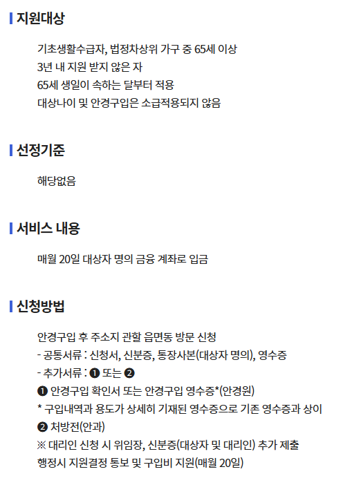 경제적 어려움을 겪는 저소득층 노인의 시력 보호 및 눈 건강 유지를 위해 안경 구입비를 현금으로 지원한다.