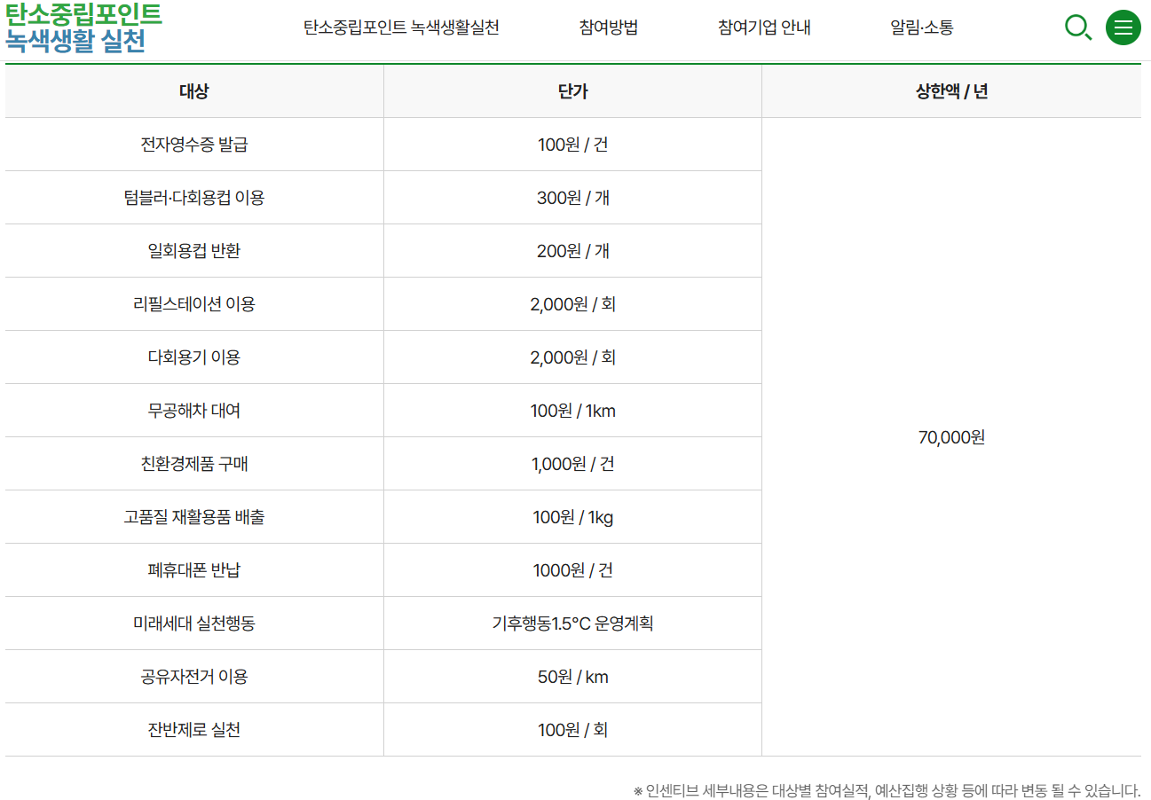 탄소중립 실천포인트는 전기·수도 절약, 대중교통 이용, 리필 제품 구매 등 일상 속 친환경 행동에 대해