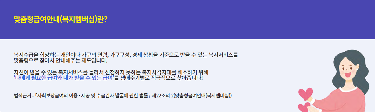 국민 개개인의 소득·가구 정보를 기반으로 받을 수 있는 복지혜택을 한 번에 안내받을 수 있는 맞춤형 서비스입니다.