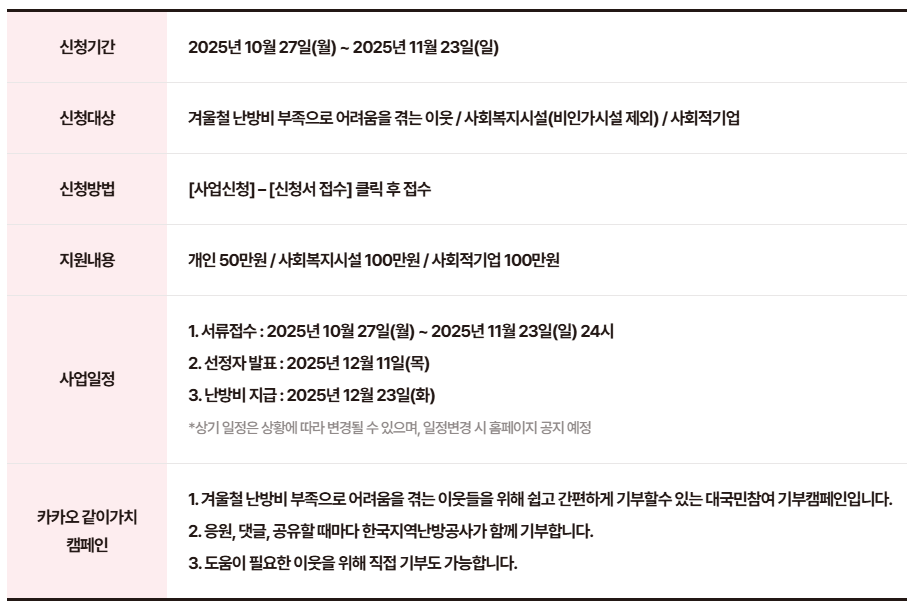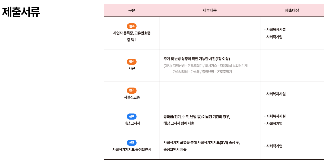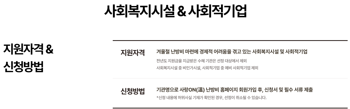 | 복지시설 및 사회적기업 | 최대 100만원 | 난방유류, 설비개선 가능 |