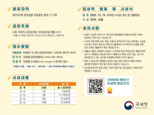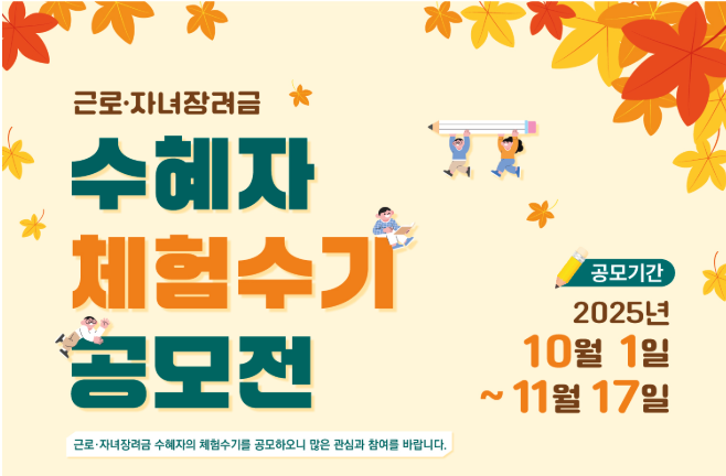 국세청은 제도 홍보를 위해 2025년 11월 17일까지 근로·자녀장려금 체험수기 공모전을 진행합니다.