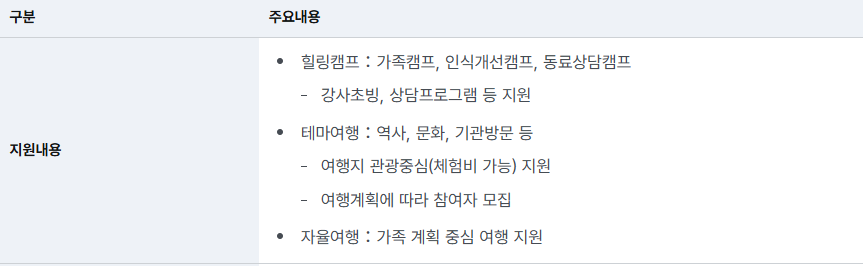 - 가족 동반 힐링 프로그램 : 가족캠프, 가족상담·코칭 프로그램, 가족 여행형 프로그램 등