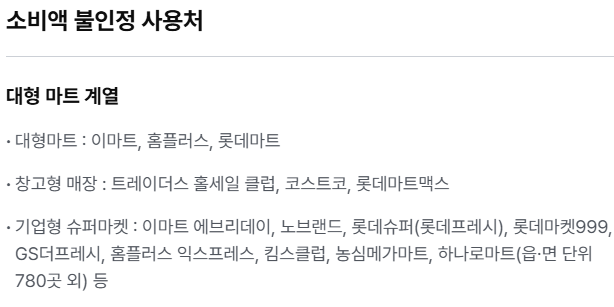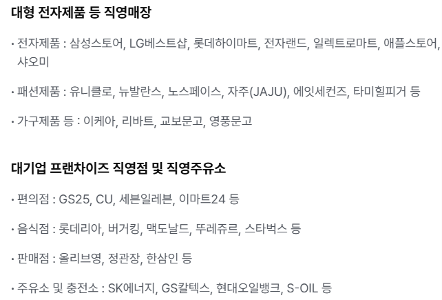 - 동네 슈퍼·중소 가맹점 : 슈퍼마켓, 식료품점, 정육점, 과일가게, 빵집 등