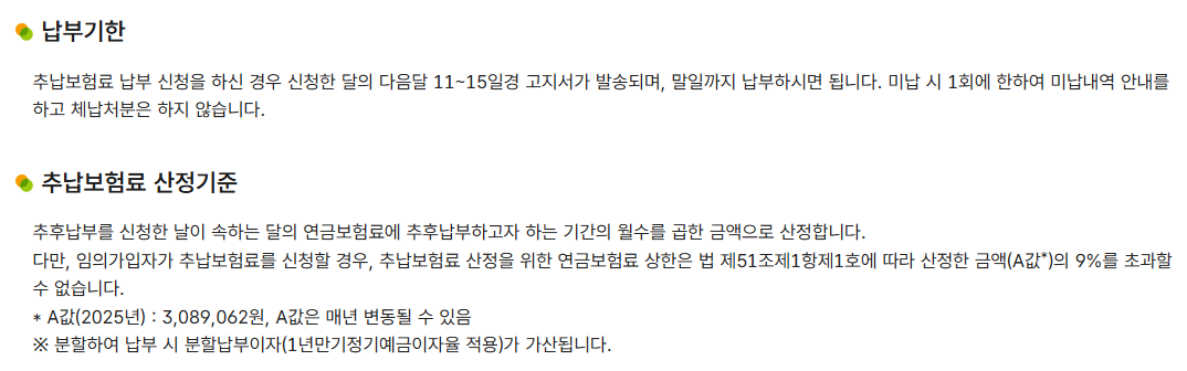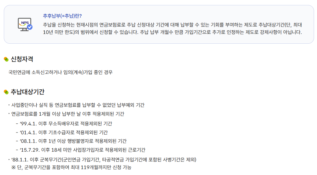 - 추납 신청 시점 기준으로 소급 가능한 기간에 제한이 있을 수 있음