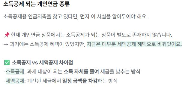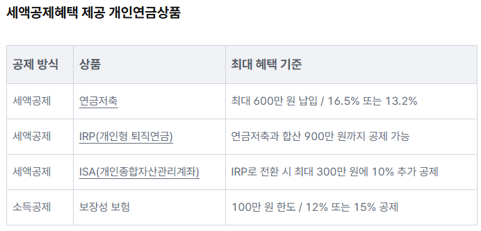- 연금저축·개인연금: 사적연금에 해당하며, 세액공제 항목에서 한도 내에서 공제를 받는 구조