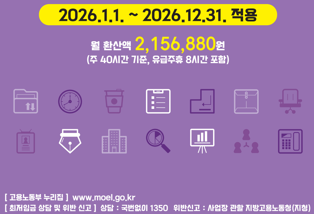2026년 최저임금 시급 10,320원과 월 환산액 2,156,880원은