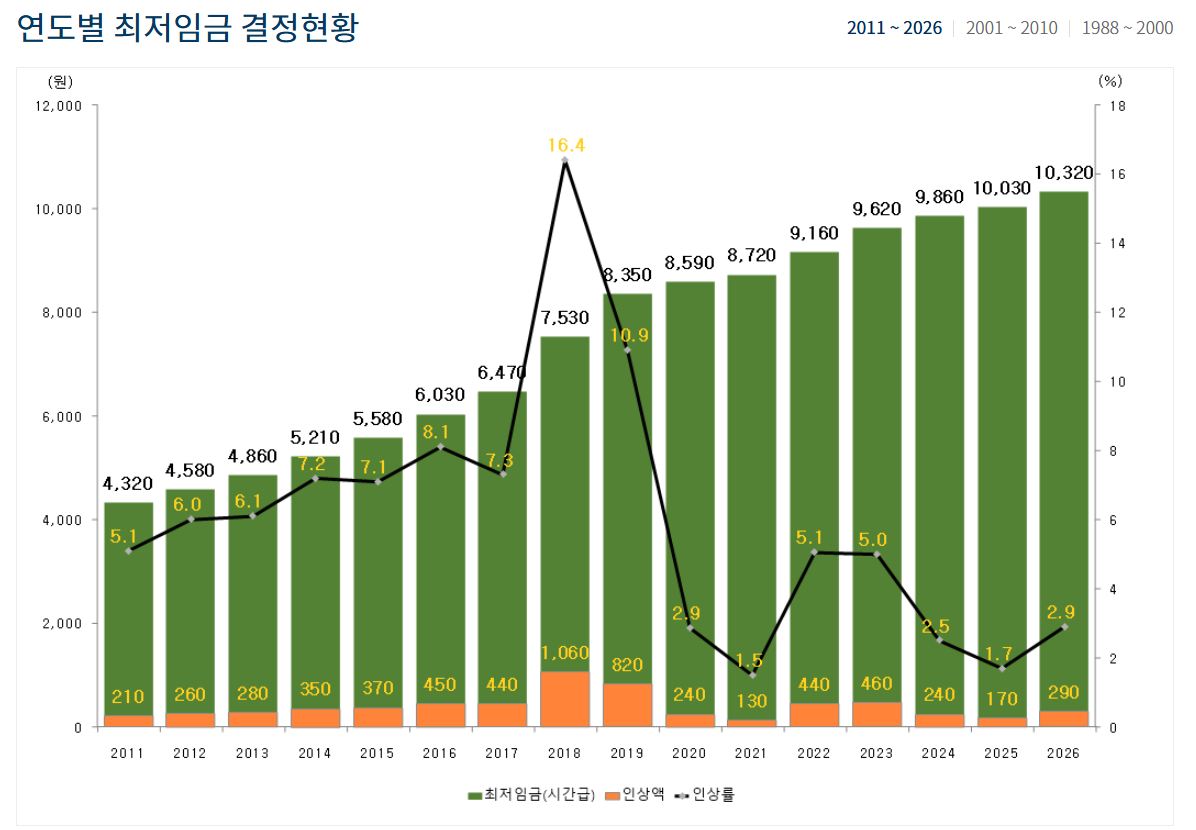 2025년 최저임금 10,030원과 비교하면 290원이 올랐고, 인상률로 보면 2.9%입니다.